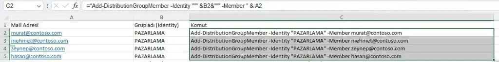 Üçüncü sütunda (komut) excel formülünde yaralanarak yukarıdaki örnek koda iki sütundaki verimizi yerleştiriyoruz.