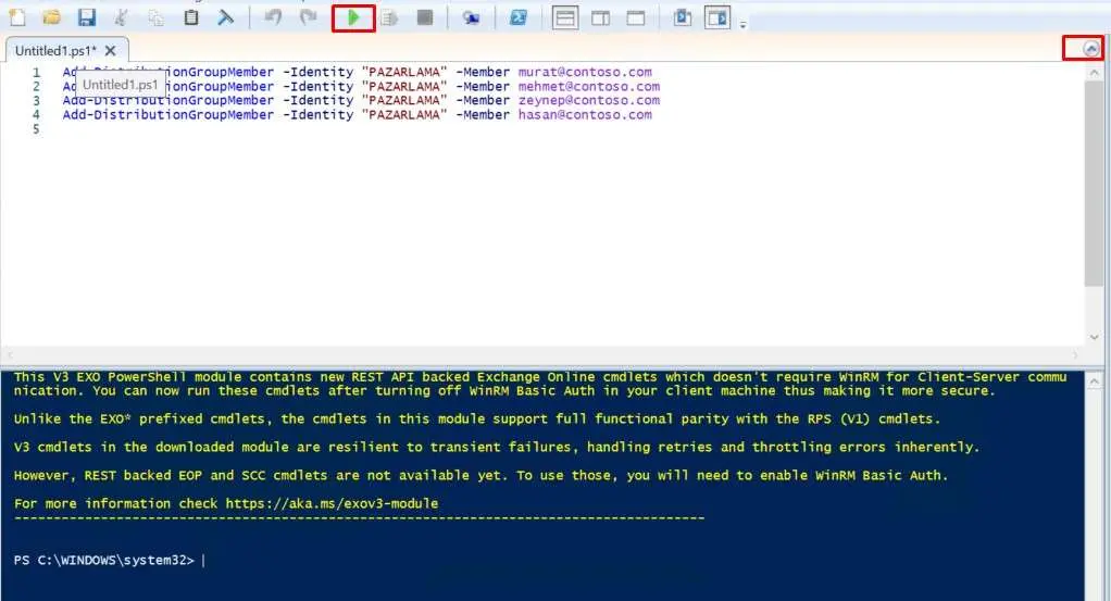 bağlantı sağladıktan sonra Windows PowerShell ISE oluşan kod listemizi script alanına yapıştırıyoruz ve çalıştırıyoruz. Hatalı satırlar uyarı olarak aşağıda listelenecek ve işlem tamamlandığında komut satırına düşecektir.