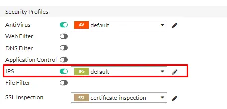 Fortigate also create a valid firewall policy to apply its IPS (What is intrusion Prevention System ?) filter, from Wan to Clinet or Wan, and in rules such as Server, the Security Profiles section also processs with defult settings.