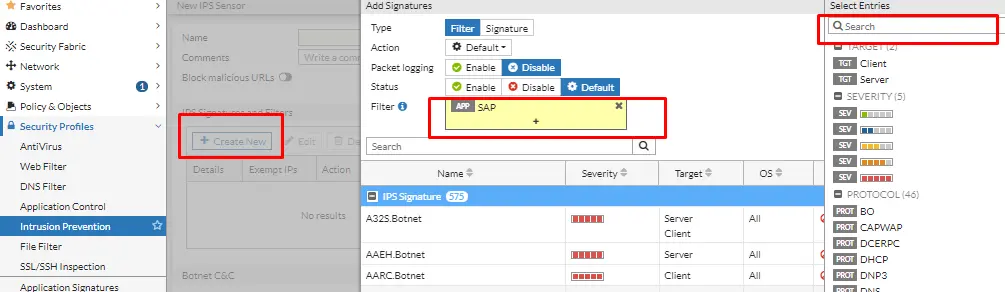 Since defult settings have over 7000 (constantly updated) IPS signatures, it would be a better decision to perform IPS filtering according to the rule in order to load less on the device. We can also do this under Intrusion Prevention in the Security Profiles menu. As follows, we can combine the signatures we need by filtering them in detail, such as OS, server, client and application type.