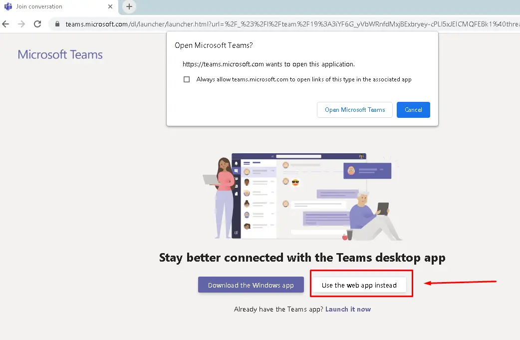 When a non-organization meeting user clicks on the invitation link, they may receive an alert on the teams app or the web, as follows.