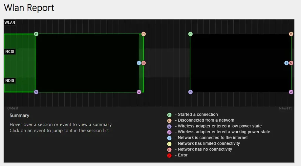 Raporun en üstünde, son üç gündeki Wi-Fi bağlantı oturumlarını ve kesintilerini gösteren zaman çizelgesi grafiği bulunur. Bu, bağlantı sorunlarının ne zaman meydana geldiğini görsel olarak anlamak için kullanışlıdır.