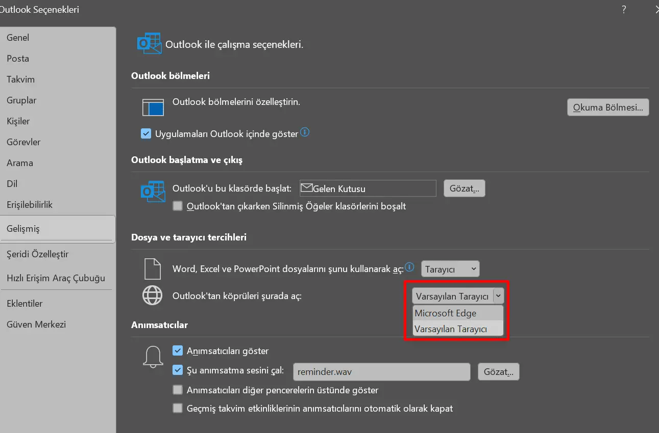 🔹 Outlook’u açın ve sağ üst köşedeki Dosya sekmesinden Seçenekler bölümüne tıklayın. Açılan ekranda Gelişmiş ayarlarda Dosya ve tarıyıcı tercihleri başlığı altında varsayınal tarayıcı değiştirilebilir.