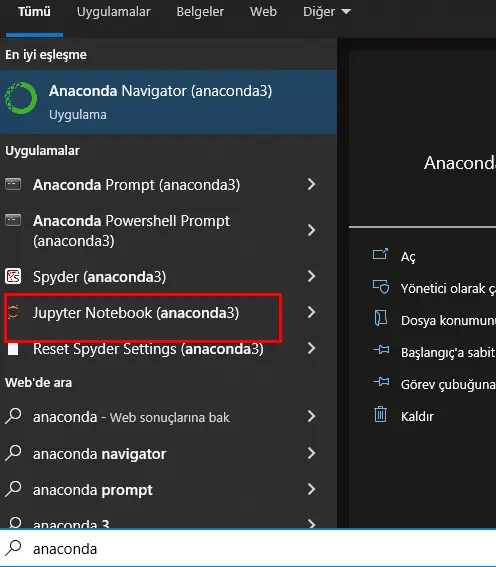 - Kurulumdan sonra bilgisayarınızın başlat menüsünde bulunan ara sekmesinin içine “anaconda” yazarak uygulamanın nerede olduğunu bulabilirsiniz. Açılan pencerede en üstte yer alan “Jupyter Notebook” a sağ tıklayarak sağa doğru açılan pencerede “Görev çubuğuna sabitle” sekmesine tıklayarak, görev çubuğuna sabitlemiş olursunuz.