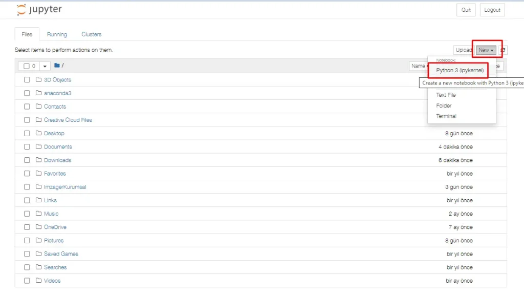 - Uygulama çalıştırıldığında web tarayıcısı üzerinde Jupyter Notebook geliştirme ortamının ana ekranı açılır. Bu ekranın sağ üst köşesinde yer “New” sekmesine tıklanır ve aşağı doğru açılan pencereden “Python3” seçilerek tıklanır.