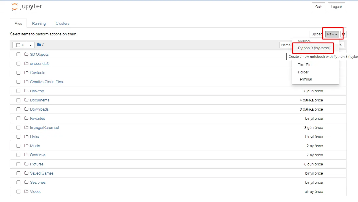 - Uygulama çalıştırıldığında web tarayıcısı üzerinde Jupyter Notebook geliştirme ortamının ana ekranı açılır. Bu ekranın sağ üst köşesinde yer “New” sekmesine tıklanır ve aşağı doğru açılan pencereden “Python3” seçilerek tıklanır.