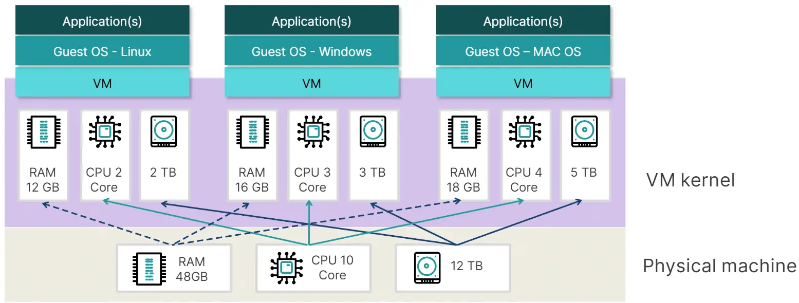 Sanal Makine (VM), fiziksel bir bilgisayarın tüm özelliklerini taklit eden bir yazılım programıdır. Bir sanal makine, ana bilgisayarın donanım kaynaklarını (işlemci, bellek, disk alanı) kullanarak ayrı bir sanal ortam oluşturur ve bu ortamda bir veya daha fazla işletim sistemi ve uygulama çalıştırabilir.