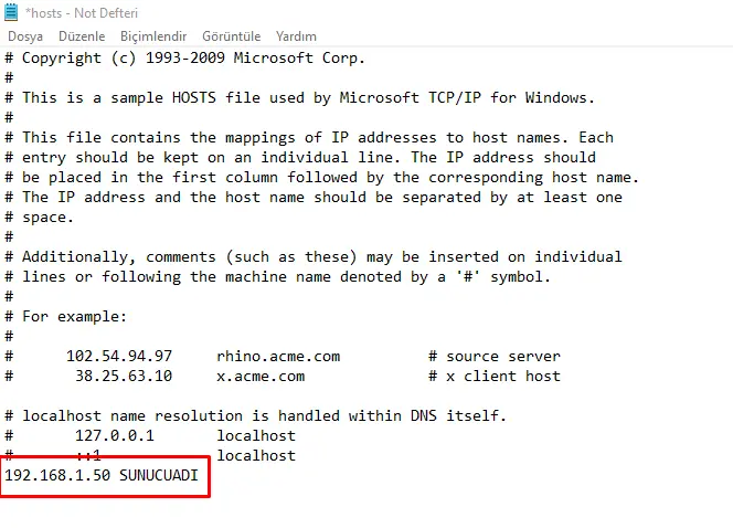 C:\Windows\System32\drivers\etc dosya not defteri ile açılır. Aşağıdaki formatta en alt satıra SQL sunucu bilgisi girilir. Dosya kayıt edilir. Bu şekilde sorunun çözüldüğü gözlemlenmiştir.