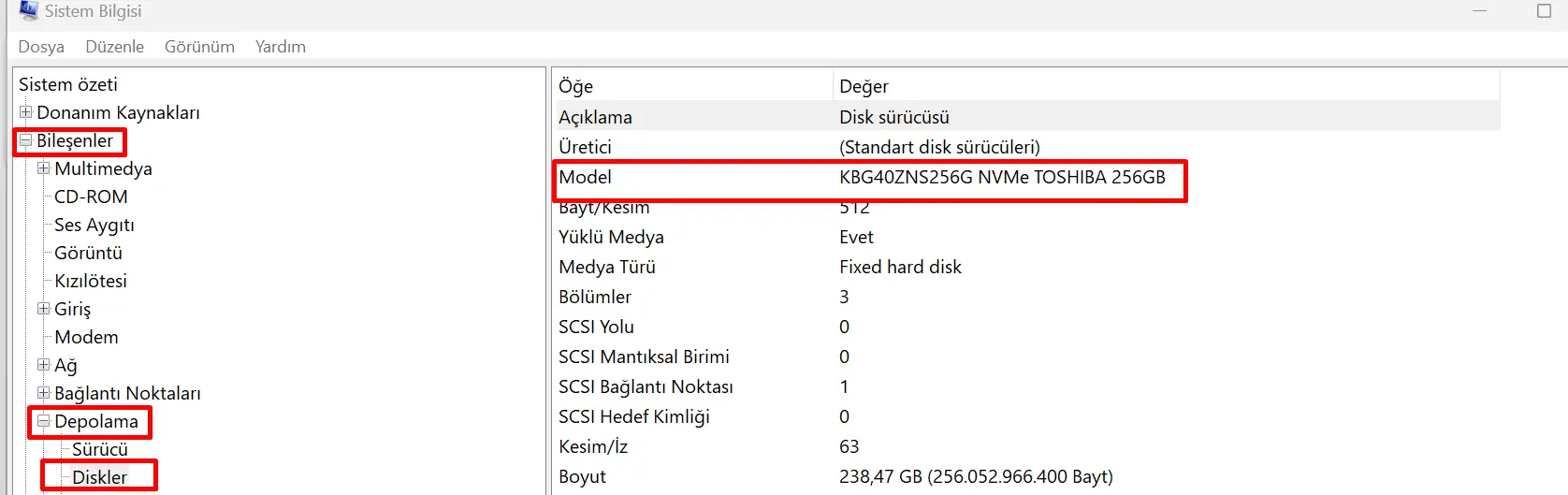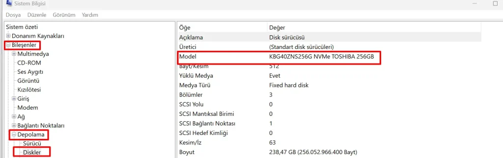 MSINFO32 (System Information) kullanarak Windows işletim sistemindeki HDD veya SSD marka ve model bilgilerini görüntülemek için aşağıdaki adımları izleyebilirsiniz: