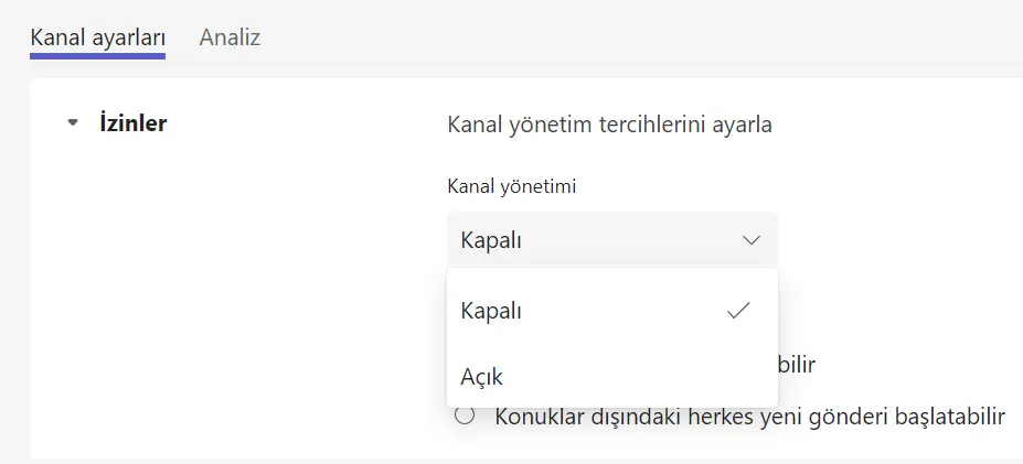 - Bunun için ekip içinde Genel kanalı dışında bir kanal oluşturmak şart. Kanal oluşturduktan sonra kanal ayarlarından “Kanal Yönetimi” açılmalıdır.