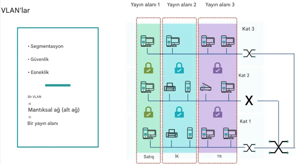 VLAN, fiziksel olarak aynı ağ anahtarına (switch) bağlı olan cihazların mantıksal olarak farklı ağ segmentlerine ayrılmasını sağlayan bir ağ teknolojisidir. Bu, aynı fiziksel ağ altyapısı üzerinde birden fazla bağımsız ağ oluşturmayı mümkün kılar. VLAN sayesinde, cihazlar farklı VLAN’lara atanarak ayrı mantıksal ağlar oluşturulur ve birbiriyle iletişimleri sınırlandırılabilir.