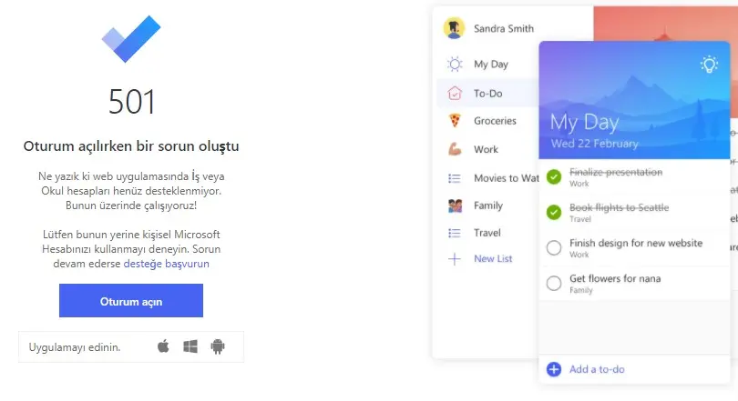 Microsoft To-Do şimdilik ön izleme sürümüyle yayında ve sadece kişisel windows hesabıyla kullanılabiliyor. İş veya okul office 365 hesabıyla giriş yapıldığında aşağıdaki sayfa bizi karşılıyor.